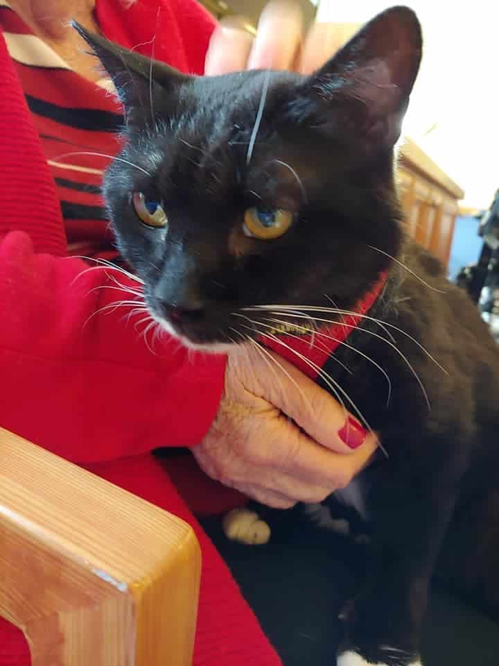On his very first official visit, he and Stafford both jumped from their strollers to curl up on either side of a bedridden, non-verbal resident. I’m told the man evidently delighted in the cats’ comfort and empathy. During his most recent visit, Tux went from one lap to another, spending long amounts of time with each resident that invited him to stay.