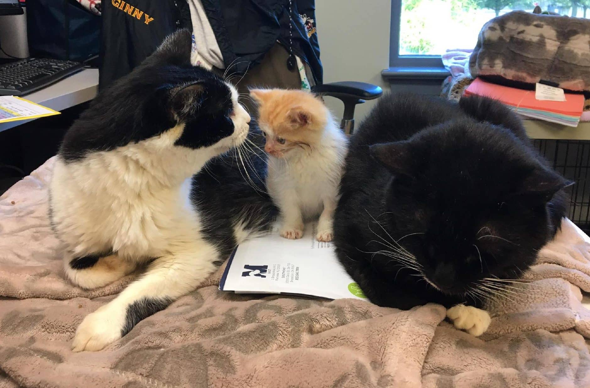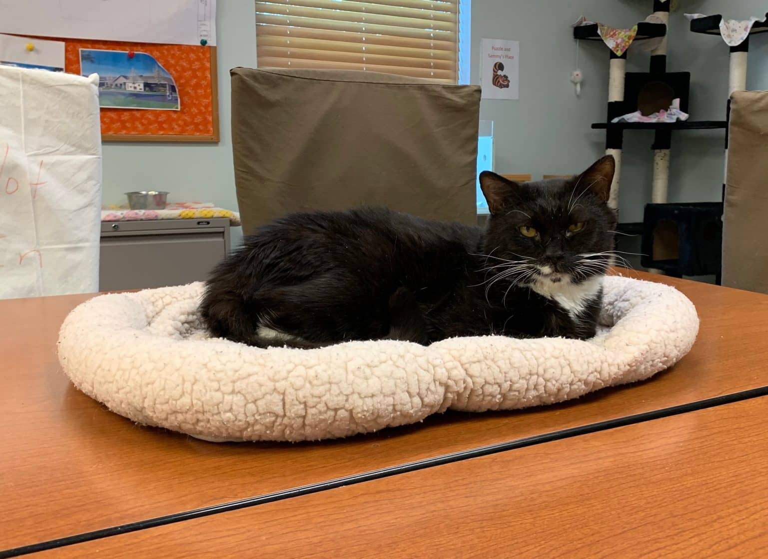 Tux was the first to notice us. I had to chuckle because he made direct eye contact with me and Dani with this look of curiosity. His stare upset Dani, who hissed, but Tux simply stared unblinkingly and then turned as if so say, “whatever, I guess she’s a hisser.” The brief encounter so perfectly summed up Tux’s approach to new things. A week into Dani’s arrival in the room, Puzzle was still trying to cozy up in spite of repeated rejection, while Tux simply ignored her entirely.
