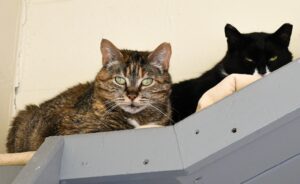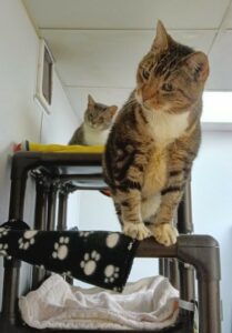 While you are enveloped in fatherly cat-love, glance over at the shelf where Emperatriz is basking. Her name says it all, whether or not she was named for a telenovela. “Emperor” is a military title, and Emperatriz heads an army of one – and occasionally Poppa Lay, although he often leads in their dance. She’s a fierce battler against FIV. For the record, Emperatriz is fierce period. Blanket statement. Besides out-fiercing Beyoncé, an orange collar reminds human warriors to be wary. But, with patience and caution, slow blinks can be exchanged with this green-eyed tabby, who is learning that she isn’t standing solo in the face of her negatively positive status. In fact, Emperatriz is surrounded by other tabbies who are in the same predicament of having a gnarly diagnosis.